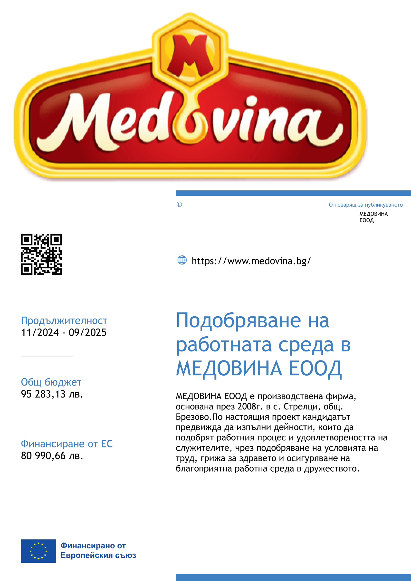 Краят на проекта е 03.09.2025г. Чрез реализацията му се допринася до осигуряване на по-добри, здравословни и безопасни условия на труд, различни социални придобивки и като цяло